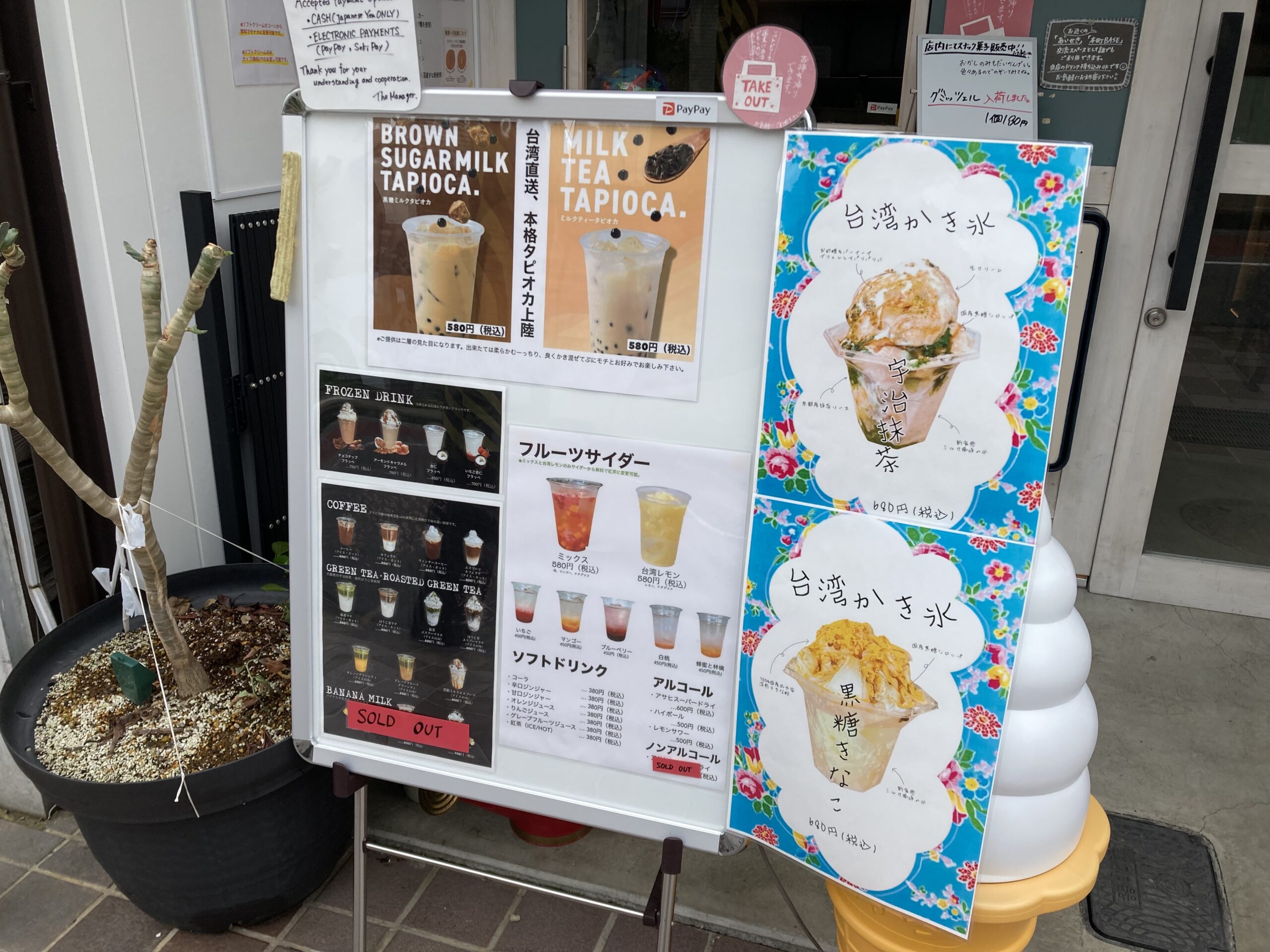 フルーツサイダー、タピオカミルク、フローズン、コーヒーや、台湾かき氷など。