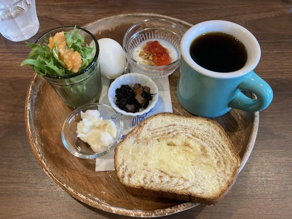 パンにサラダに惣菜一品(二品?)にゆで卵、プチデザートもあって満足、なんとも幸せな気持ちになれるモーニングです。